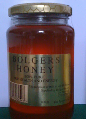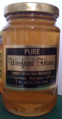 Amongst one lady’s suggestions she’d added bakery as a possible retail outlet. In ‘La Cuisine’ I found ‘Pure European Honey’ from Tony Walshe, Carrigbyrne Apiary, FOULKSMILLS. In the mean time another friend suggested ‘Kate’s Farm Shop’, I’d passed ‘Kate’s’ on my way to Duncannon at the weekend. I found two pots there, ‘Bolgers’ Honey, a Unique blend of Irish and non EU honey from some place near Enniscorthy. Also Wildflower Honey, from Loch Gorman fine foods, Castletown, Gorey, County Wexford. All are 100% honey.